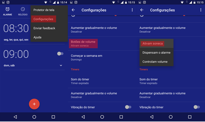 Para isso, abra o aplicativo Relógio, toque sobre o botão de três pontinhos, depois em Configurações > Botões de volume e escolha uma opção que não seja a "Dispensam o volume".