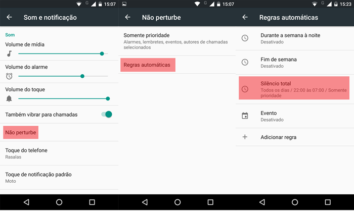 O modo "Não perturbe" permite que o usuário defina algumas regras que ativam períodos de silêncio automaticamente, como durante a noite, fim de semana, evento ou alguma nova regra adicionada, por exemplo das 7 a.m. até as 12 p.m., duração das aulas de uma escola normal ou o que você preferir.