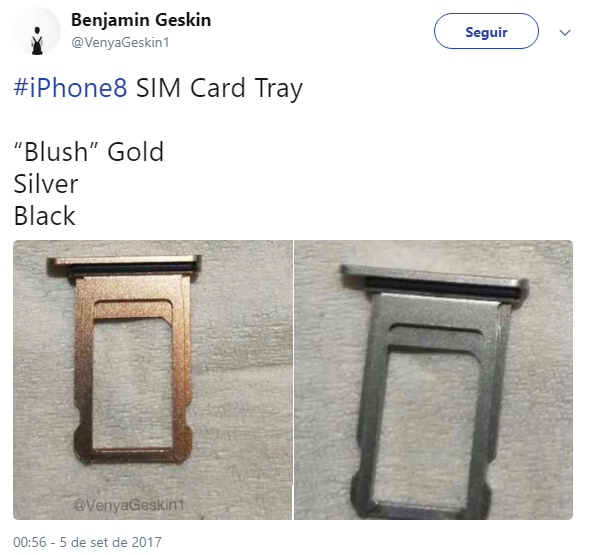 Como é possível notar nas imagens, a gaveta do SIM card do iPhone 8 entrega que o aparelho deve ganhar uma versão dourada e outra prateada. Geskin até compara a cor da gaveta dourada do novo iPhone com as gavetas das unidades rosa dourado e dourado do iPhone 7.